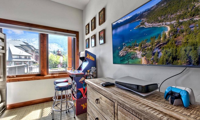 Discover the ultimate mountain retreat at our luxurious and unique condo, steps from the Heavenly Gondola. Enjoy stunning views from the large balcony, free ski and snowboard valet, heated pool, 2 hot tubs, and a well-equipped gym. Just 4 blocks from Lakeside Beach and Marina with free entry passes. Private parking, walk to Heavenly village, casinos, and gondola. Balcony BBQ, 3 TVs, Arcade, PS5, fireplace, wine fridge, family-friendly amenities. WIFI, AC, washer/dryer, gourmet coffee options. Unwind on Pottery Barn/Restoration Hardware furniture. Your perfect escape awaits with 24-hour front desk concierge service.