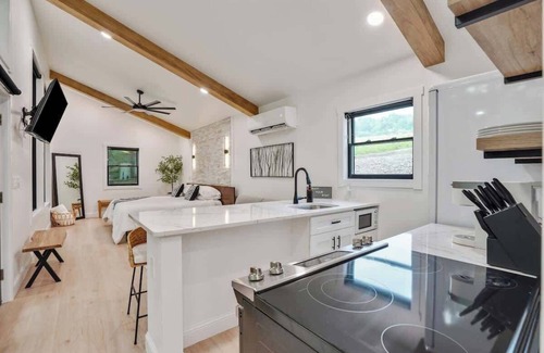 Welcome to The Retreats Hocking Hills & your brand new 1-bedroom, 1-bathroom modern cabin, The Ashton, nestled amidst the enchanting woods of Hocking Hills. The Ashton is a secluded retreat thoughtfully designed to provide the ultimate haven for couples seeking tranquility and an escape from bustling city life. The exterior features a combination of sleek lines, warm wood accents, and expansive windows that offer breathtaking views of the lush forest canopy. NEWLY ADDED STARLINK INTERNET/WI-FI!