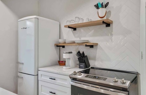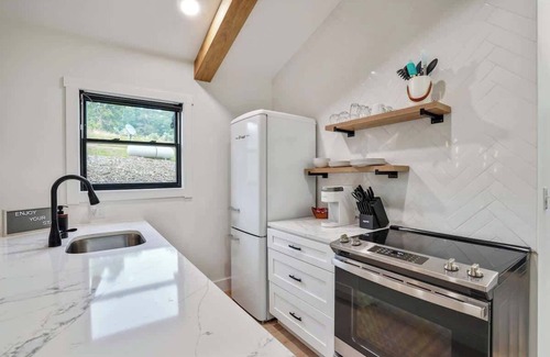 The modern, yet unique design of this tiny house allows it to not feel “tiny” and the full kitchen takes advantage of this layout. High end appliances, countertops and cabinets line the kitchen while the elevated dining bar allows you to enjoy any meal!