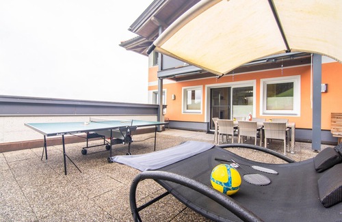sauna(paid), balcony, terrace, garden, garden furniture, BBQ(charcoal), 4x parking, deckchairs, table tennis table, 1x children's bed (excl. bed linen), 1x high chair, awning, Sunscreen