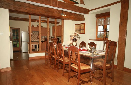 A welcoming living area: a large lounge with a dining space and a pellet stove. For entertainment, the property is equipped with a TV (French channels), DVD player, a selection of DVDs, books, games, and toys.