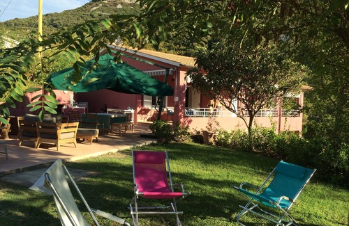 The bungalow comprises: large living room with tv, dvd and satellite connection and adjoining large kitchen, both giving onto extensive terraces; 2 double bedrooms, 1 with large double bed with double doors to a terrace, the other with single beds; modern eat-in fully equipped kitchen, and bathroom with large shower. In all, the inside area is approximately 65 sq m. All rooms are luxuriously furnished, with heating/air conditioning. A washing machine is located on the lower terrace, together with a washing line. There are several beautiful extensive terraces, two porticoed at the bungalow, one with lawn adjoining the bungalow overlooking the bay of Sant'Andrea , the other, accessed across a snake-path, directly overlooking the sea, the Italian coastline and the island of Capraia (children must NOT be left unsupervised on this terrace). The terraces are variously equipped with tables, chairs, modular outdoor furniture, sun-beds and barbecues. There are two outdoor showers, one overlooking the mountain, the other on the terrace directly overlooking the sea. There is also a ping pong table with bats and balls. There is parking on the premises. Bed linen and towels are provided.