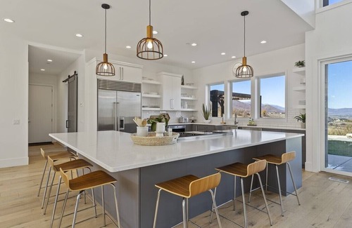 Easily bring in fresh mountain air with grand sliding glass doors to the back patio. The home offers airy and open spaces on two levels, with two bedrooms on the main level flanking the spacious main living space. The kitchen offers quartz counters with large island, Wolfe range, large Subzero fridge, two-tone cabinets, open shelves, large pantry, and butler's pantry with sink and direct outdoor access. Perfect for entertaining, the great room is open to the outdoor living space drawing family and friends to immerse in nature's beauty. Invite friends and family to make a wood fired pizza or barbecue in the outdoor kitchen, or just linger under the pergola, in the hot tub, or under the sky and watch the sun set over the Wasatch Mountains.