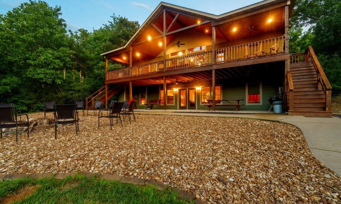 Guests can enjoy an afternoon of fishing or relaxing on the gravel bar and later sit by a bonfire or watch the sunset from more than 500 sq. ft. of covered deck. Free firewood provided to guests (for bonfire area only). A local floating venue can be arranged to come and pickup your group for a 7-mile float trip where you finish right at our gravel bar. They will then come get the canoes, kayaks or rafts and you just walk up to the house.