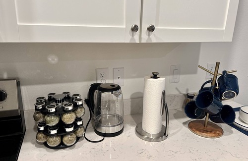 The kitchen is fully equipped with modern appliances and even comes with a coffee maker and complimentary coffee, so you can start your day off right. The dining area features a table that seats 4 and countertop seating for 4, so everyone can sit down and enjoy a meal together.