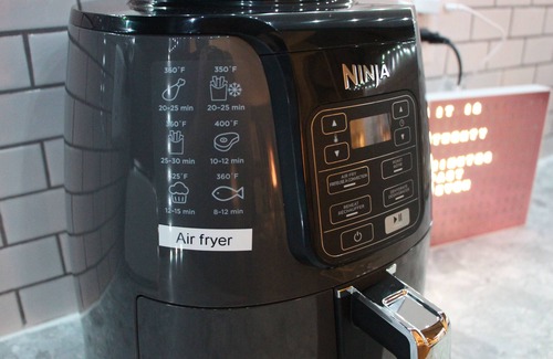The kitchen includes several amenities, such as a gas stovetop, dishwasher, a large fridge with a built-in ice dispenser, an air fryer, a touchless hand soap dispenser, and more.