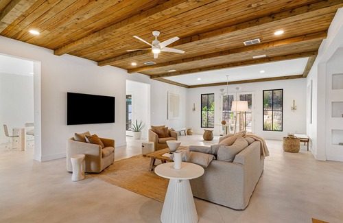 Inside, you'll discover vaulted wood ceilings, plush furnishings, and airy rooms. The expansive living room is bathed in sunlight and offers a comfortable space to sit back and stream your favorite shows. Steps from here, the gourmet kitchen radiantly gleams with its full suite of high-end appliances and center island. Some of your favorite memories made at Serenity Now will be gathered around the dining table, indulging in delicious meals with your loved ones.