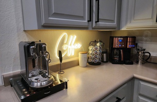 Bonus items include Keurig coffee machine, Breville coffee machine, Margarita machine, Ice machine, Bartizian cocktail machine, Ninja Air fryer, Ninja blender, Popcorn maker, Waffle maker, Cuisinart food processor and chef sharp knives. This kitchen is fully loaded with enough to serve 16 people.
