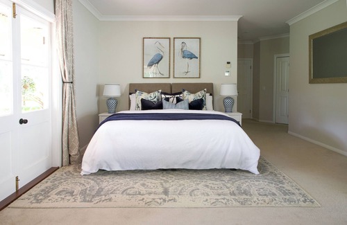 The Master Bedroom is huge with a king bed (can be separated into 2 single beds), with large en suite bathroom, 2 person spa-bath and separate shower; the bedroom looks out across the lawns. Bedrooms 2 and 3 have queen beds both rooms look out onto the pool area and bushland. The large second bathroom has a bath and separate shower. There is also a separate powder room with double basins. And a separate toilet.