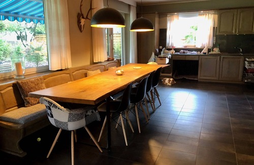 Very spacious cottage with more than 350 square meters for up to 12 - 14 people. Ideal for 2 to 4 families. The rooms are located on the first floor and in the converted basement. The ground floor are the common areas (living room, kitchen, library and transition).