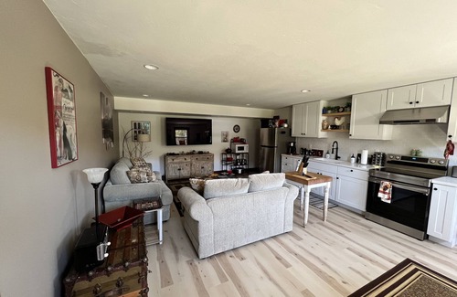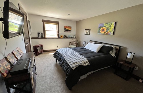 Experience farm life in style! This fully furnished modern attached guesthouse with private entrance sits on beautiful grounds and gardens with a full view of Mount Hood. Enjoy world class biking, hiking, and water sports! It’s a 10 minute drive to historic downtown The Dalles for wine tasting, brewpubs, and shopping. The Columbia River boasts some of the best wind surfing in the country. Hiking, fishing, and skiing, are all within striking distance too. Come home to a luxury open concept apartment with well stocked kitchen and game room. The main bedroom has a comfortable queen bed and walk in closet. The game room boasts a combination pool and air hockey table, along with lots of games and books. There is also a comfortable double futon bed and access to a washer and dryer. Smart TVs are available in both sleeping areas. Electric fire places create a warm ambiance in the bedroom and living room. Large windows along the length of the whole apartment make sure you don’t miss the stunning views and wildlife. There is a gas fire pit and patio right outside the door along with gas grill and utensils. Trickle charging for your EV is available!