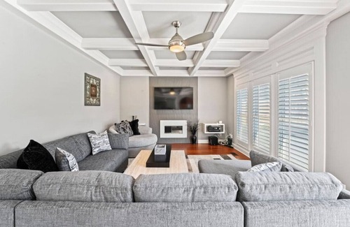 The whole group will be comfortable in this spacious and unique space. If you are looking for a 10 out of 10, YOU HAVE FOUND IT! Formal Living Room has Beautiful Beams and Electric Fireplace w/ Sliding Glass Door walking out onto patio and pool. Upstairs you will find an amazing Master Suite, Two Closets, and spacious Master Bath w/ heated floors, and large Shower. Two addtional bedrooms up w/ newly updated Baths. Step outside to an AMAZING Oasis w/ Gorgeous Patio, Pool and Hot Springs Spa!!! Our pool is equipped with a pool heater, if you would like to request the heater turned on for your reservation, please send us a message, an extra fee does apply.
