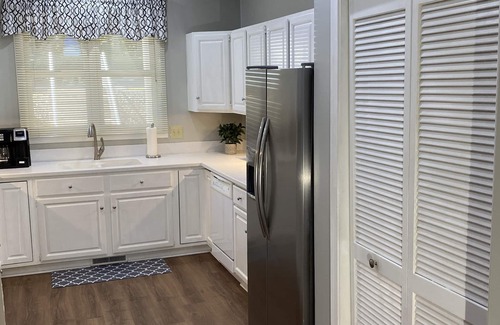 Our condo is easily accessible, located on the first floor. Furnished with all new furnishings throughout the condo. Sit back and recline in the power sectional sofa and enjoy the ambiance of electric fireplace logs at the push of a button. The unit has Wi-Fi and a smart TV capable of streaming and internet access. The master bathroom is spacious with a jetted tub and oversized walk-in shower with several body jets adjustable for a light massage or adjust the handheld shower head for a deeper massage. The master closet has a complete closet organizing system to keep your belongings orderly. The master bedroom has an adjustable bed to relax and read a book or a massage as you relax to sleep at night. In the morning enjoy your coffee on the patio while rocking in the chairs and listening to the fountains below surrounded by the trees. The second bedroom has an en-suite complete with large tile shower with several body jets and handheld unit as well. There is also a large vanity and storage unit for necessities. The kitchen is fully stocked with all the amenities of home, from the abundance of small appliances to spices, baking supplies, condiments, coffees and teas. There is a laundry center in the condo with full sized appliances and cleaners are provided. We have diligently worked to ensure your stay at our condo will be a memorable stay with all the amenities of your home.