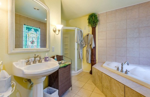 Located in the Carriage House on the 2nd floor (private entrance). This elegant, spacious is located upstairs in the Carriage House! With it's own private entrance. This suite has a KING BED & TEXAS SIZE WHIRLPOOL TUB & a separate walk-in shower, loveseat, TV, free WIFI, mini fridge, coffeemaker, microwave, robes & luxury amenities.