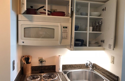 The studio has a fully equipped kitchenette, 42" flat screen TV with cable / WiFi, quality king pillow-top bed, desk, chairs and a sleeper sofa. The room art detail includes Honduras Mahogany Art by Jim Mitchell. The glass end wall overlooks Biscayne Bay and opens to your private balcony to enjoy morning coffee or afternoon and evening drinks overlooking sailboats and fantastic ocean views with wonderful ocean breezes. The bathroom has a teak bench and soap, shampoo, conditioner, and lotion amenities - professionally cleaned and maintained.