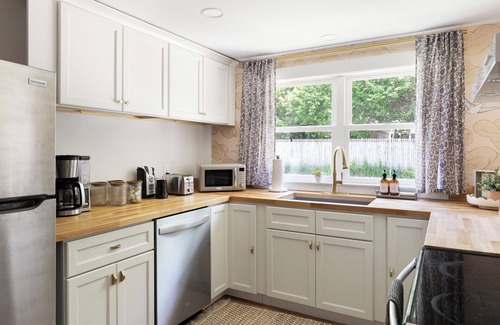• Well-appointed appliances: full-sized fridge, freezer, oven, stove, microwave, Ninja blender, drip coffeemaker, coffee grinder, hot water kettle, detached large electric griddle, handheld electric mixer, food processor