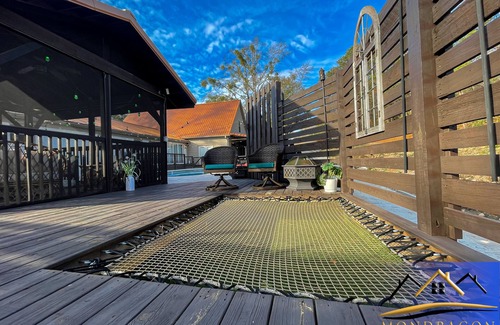 Never a dull moment in the game room: pool, foosball, darts, ping pong, arcade games, and more! Outdoors, enjoy a cozy fire, bird watching, trampoline bed, karaoke, and multiple seating areas.