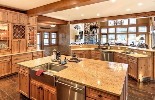 Take advantage of the custom chef's kitchen, which is complete with high-end appliances, 2 sinks, and 2 dishwashers. This is an optimal space for preparing inspired meals for a large number of guests. Share your plate at the sleek breakfast bar or in the rustic dining area with seating for 8.