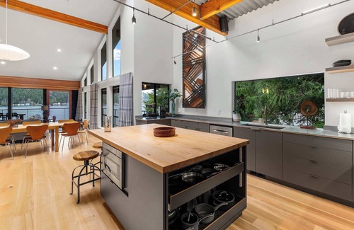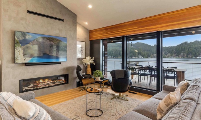 Escape to The Everlake, a stunning and expansive lakefront retreat on Summit Lake! Accommodating 12 guests across 5 bedrooms, this architectural gem features breathtaking views, two private docks, a covered hot tub, kayaks, and ample outdoor seating. An open layout boasts high ceilings, walls of windows, a chef's kitchen, and a dramatic floor-to-ceiling stone fireplace. Conveniently located near waterfalls, hiking trails, parks, and golf courses, your Pacific Northwest adventure awaits!