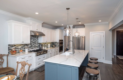 At the end of the day relax in this 4,400-sf home, with an open-concept floorplan and lake views from almost every room. Enjoy the great room with vaulted-ceiling and floor-to-ceiling stone fireplace. Open the glass sliding doors and enjoy almost year-round outdoor living on the oversized porch, with lakefront and backyard views. The great room flows seamlessly into a true gourmet kitchen, outfitted with a Jenn Air 6-burner cooktop and double ovens. A large island comfortably seats four, while the adjacent eat-in dining space seats six.