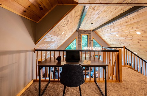 The Hibernation Station Loft: the loft has 2 twin beds, a queen bed and lounge area with sectional, games table and Roku TV.