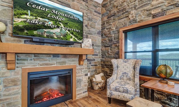 With its open floor layout, beautiful views of Table Rock Lake, the Ozark Mountains, and the sounds of Silver Dollar City in the distance, the brand-new LUXURY Cedar Mountain Lodge will win your heart. For large gatherings or for multiple families to go on vacation together, it is the ideal location. This 3300 square foot lodge comfortably sleeps 18 people. There are 3 levels with 6 bedrooms, 6 bathrooms and 2 half baths. The beautiful cedar beams that line the vaulted ceiling and the field stone rock wall gives this lodge a stunning rustic lodge-like appearance and atmosphere. The location of the lodge, a short walk to The Landing at Eagles Nest Clubhouse & amenities, makes sure that family fun is just steps away! After a long day visiting Silver Dollar City, nothing beats the short 1/4 mile drive back to the condo. Boasting with granite counter tops through out and a large well stocked kitchen, the design of this lodge is luxury. The dining room table, with seating for 14 & 4 at the kitchen bar allows everyone to have family meal time together. The neutral and comforting tones makes this lodge a perfect fit for a relaxing get away. This will be a space you will want to book year after year.