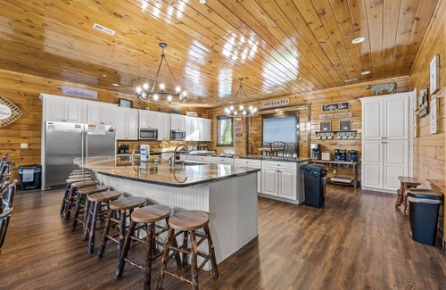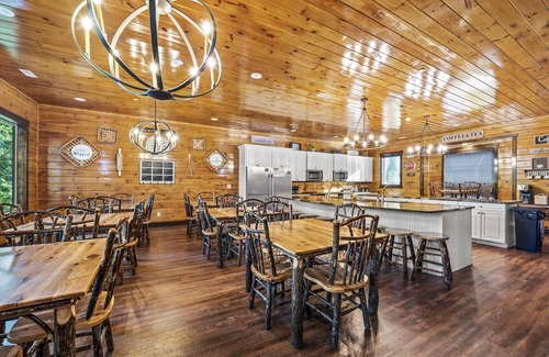 Your comfort and enjoyment are prioritized here with a plethora of amenities to enhance your stay. Enjoy two outdoor hot tubs for relaxing evenings under the stars, along with access to a community indoor pool perfect for casual gatherings. The cabin features a game room and a theater room, ensuring entertainment for you and your guests. Each of the 13 King suites comes with its own bathroom, providing private retreats after festive days filled with love and laughter. A fully equipped kitchen allows for seamless meal preparation, making your wedding festivities effortless.