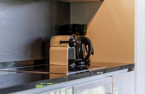 Ground floor: (Living room(TV, stove(wood)), open kitchen(electric kettle, cooker, coffee machine(filter), coffee machine(cups), oven, dishwasher, fridge-freezer), Bedroom with bathroom(double bed, shower, washbasin, toilet), toilet)