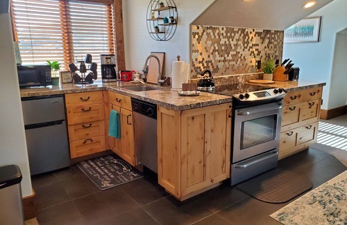 Cozy and warm with fur rug and plenty of soft lounging spaces. Full kitchen w/ oven, range and dishwasher. Granite countertops, small fridge. Stacked washer/dryer, Wi-Fi, new TV/DVD. Mattresses are new and very comfy! Brand new couch that becomes a queen bed.