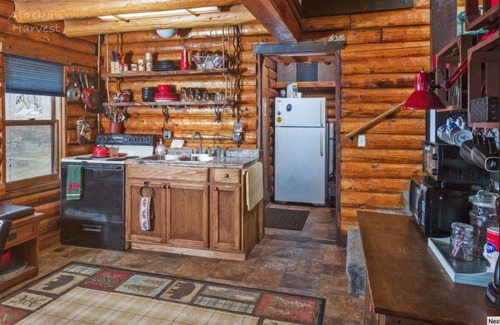 Alaska's Harvest Luxury log cabin has a breathtaking view and oversees our pasture of a small herd of Shetland Sheep we raise. Moose often meander through out property. The cabin has 3 spacious bedrooms with king and queen beds, a full kitchen, living room and spacious front porch to sit and enjoy the view. There is wifi throughout. The cabin is located on 15 acres of forest and trails so feels remote but is only 2.5 miles from downtown Palmer. We are near the Reindeer Farm, Musk Ox Farm, Independence Gold Mine and the Alaska State Fair grounds. Trails are abundant. The cabin is fully furnished in quality and comfort. Washer & dryer are included.! You will want to stay longer!