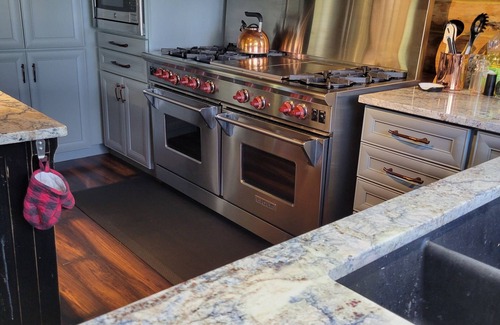 Fully Equipped Kitchen: Your culinary dreams can come to life in the state-of-the-art kitchen featuring a Wolf stove, two convection ovens, and plenty of dining space, ensuring that catering any event here is both enjoyable and efficient.