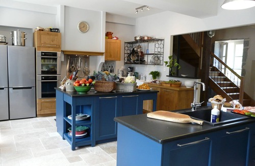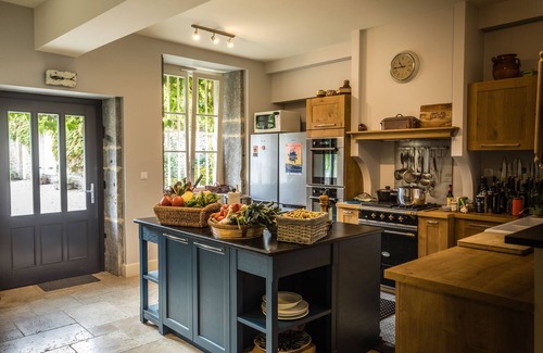 The open-plan semi-professional kitchen is in the center of household activity. Sliding metal 'atelier' doors allow the kitchen to be versatile, open or closed as needs be. Three ovens, eight burner on two tops, three refrigerators, two work islands and lots of storage make this an ideal work space for those interested in the culinary pleasures of Burgundy. An herb garden is just out the door in the courtyard. A separate bread house serves as a summer kitchen, with wood-fired oven, fridge, plancha and prep and clean-up surfaces.