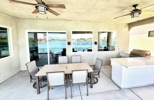 You'll fall in love with the professionally designed, modern, family friendly dessert oasis on the Arizona side, minutes from California border. The backyard features a very large shaded covered patio (free of afternoon sun), custom outdoor peninsula with a gas BBQ grill. Inside features an open concept living room and kitchen with large island and seating. Unobstructed views of the private community lake NOT CONNECTING to the Colorado river; view of nearby Mountains and magnificent Arizona sunsets. Wake up to water front sunrises, only steps just outside your master. The Colorado River is a 5 min walk away.