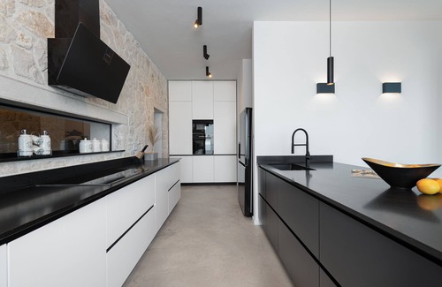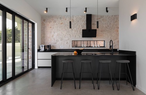 Spacious villa contains 5 bedrooms with en-suite bathroom , each with double bed, air conditioning,smart TV, terrace access. Four bedrooms are on the top level while one is on the ground floor. En-suite bathrooms have two sinks and a shower , while one on the ground floor also has a freestanding bathtub. The large glass walls make the house feel airy, allowing for views of the environment from almost every corner of the villa. The villa is functional and minimalist. A living room with an indoor fireplace and a smart TV is connected to a dining room and a fully equipped kitchen. Connected spaces are ideal for family and friendly gatherings. The lower level of the house has a direct access to the pool and outdoor patio. Behind the kitchen is a large pantry. The villa also has an outdoor kitchen with a large dining table.