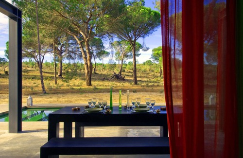 Situated in Alentejo coast, more specifically Herdade da Comporta, in a quiet little village called Muda. With 19 hectares of land, the house is in the middle of a pine forest with nothing else around but nature, explaining the name Monte Verde (Green). Just 1 hour drive from Lisbon, you can find a long lengthen (60 km) of the most wanted and almost desert beaches in Portugal. You can find all of this only 10 minutes away from this summer house.