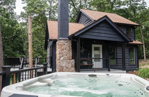 Getaway high in the mountains. Equipped with all the luxurious comforts of home while hidden deep in the woods for peace & privacy; this hidden gem has everything you're looking for with its spacious hot tub illuminated by string lights. Cozy up to the strategically set outdoor fireplace. Spend tranquil nights with the bonfire while listening to the sounds of nature. Enjoy breakfast or twilight meals with excellent views of the stars and mountains on the ample deck.