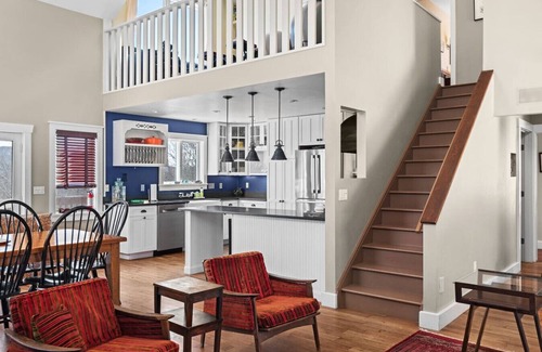 A formal dining area leads out to the wraparound deck, where you’ll find outdoor seating and a gas grill. Also on the main floor is a luxurious primary suite with a king bed, gas stove, deck access, and en suite bath featuring a steam shower and clawfoot soaking tub. A half bath is located nearby for guest use.