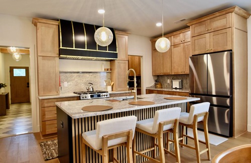Family and business friendly: This home is designed for a variety of guests, from families on vacation to business travelers needing a centrally located, functional space. So whether you are relaxing on the front covered porch or private backyard covered deck, wanting to whip up something homey in the well appointed kitchen, wanting a fully functioning office space to remain in the know, or just wanting to pamper yourself with luxury living, then check out this well designed modern cottage.