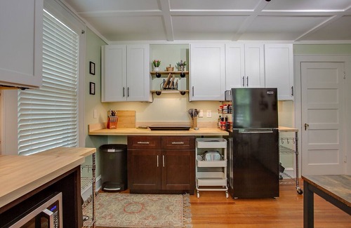 • Kitchen - two-burner induction cooktop, full-size fridge and freezer, combination microwave/convection oven, crockpot, airfryer, toaster, Ninja blender, coffee maker, French Press, electric kettle, deep restaurant-style sink with drainboard, and stocked with cookware, bakeware, spices, cooking oil, coffee and an assortment of teas. Dining table with seating for four.