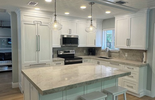 This home was gutted and completely renovated in November 2023. Located in the heart of Delray Beach, this 3 bedroom & 2 bathroom pool home is surrounded by multi-million dollar homes in an upscale Delray Beach neighborhood. It has an open floorplan, 2 new gorgeous bathrooms, a new quartzite kitchen with high-end appliance, an eat-in island, & a beverage fridge! The backyard is a tropical oasis with a 400 square foot covered patio & 60 inch outdoor smart TV. There are Phantom Screens on all the french doors, a must in South Florida. The oversized heated saltwater pool with a waterfall spa is amazing, it is rare to find such a large pool in Delray Beach. There is an outdoor shower, a putting green, & an outdoor kitchen all in a beautiful lush setting! We just installed a tall white privacy fence, all new landscape, & the custom putting green in 2021 to make it a backyard you never want to leave! Sit in the hot tub & watch the football game or your favorite TV show while dinner cooks on the grill. The pool safety fence can be put up upon request & is an added bonus for families with young children. We also have a highchair, pack n’ play, lots of toys, & everything else needed for traveling with young kids. All new furniture, new mattresses & bedding, & new smart TVs in every room! Two separate family rooms with TVs leave plenty of room for everyone to spread out & enjoy this sprawling ranch home close to downtown Delray & the beach! Pictures just do not do this house justice, as you can see from the reviews! Our Lake Ida neighborhood has 3 parks to enjoy and is great to walk or bike around. Delray Beach was voted "The Most Fun Small Town In America" by USA Today & the New York Post called it "South Florida's emerging IT town" after one trip here you will see why! Dine at one of the more than 150 restaurants downtown or enjoy the beautiful beaches & water sports! The Delray FreeBee will pick you up from our home & take you anywhere you want to go in the city & bring you back home for free! Don't miss out on this little slice of heaven that has become our second home!