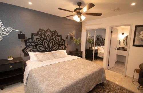 Relax in the comfortable bedrooms, each with its own bathroom, ensuring privacy and convenience. The larger bedroom has a King bed, a seating area, a work station, and a private bathroom. We've added a single bed in the large closet in the room in case you need extra sleeping space. The bathroom was just remodeled and has a sleek, modern design & a waterfall shower head.