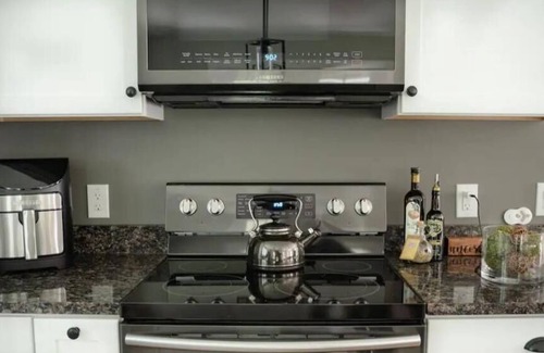 The kitchen is well equipped with all of your cooking/baking needs including the kitchen basics (sugar/flour/spices/baking soda/condiments/cooking spray). We have a coffee station, air fryer, high end blender, mini waffle maker, electric mixer, crock pot and wooden salad bowl and strainer.