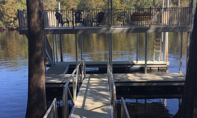 We have a 2 bedroom, 2 bathroom house right on the Suwannee River. The house is 1/2 mile off of US 19 with paved roads straight to our address. The house has an upstairs covered deck right outside the living room with ceiling fans and comfy patio furniture to watch all the river activities. It has a two story covered floating aluminum dock with swinging chairs as well as space to accommodate your boat or jet skies. There is a public boat ramp about 1 mile down the river near the Suwannee Belle Landing, a great local restaurant with access via boat or car. Our kitchen is fully stocked with new pots, pans, dishes, cups, and most anything you might need. There is also a grocery store just 1/2 mile away for your convenience.