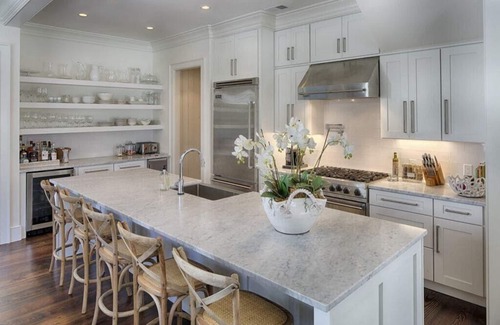 • Chef's kitchen with oversized center island (seats five), high quality appliances, and generous countertop space, flowing into a formal dining room for eight