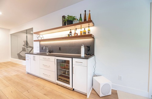 Whether you're preparing a gourmet meal or enjoying a glass of wine, the kitchen is equipped with top-of-the-line Thermador appliances, solid white oak cabinets, and a wine cooler. The walk-in pantry ensures you have all the space you need for your culinary adventures.