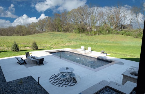 Dive into the heated pool with 6-inch swimming jets. The outdoor area is designed for ultimate relaxation and fun in the sun.