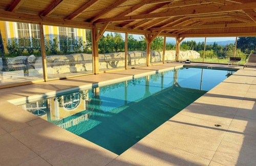 The covered, private outdoor pool, heated all year round, offers relaxation and wellness in every season – enjoy it under the open summer sky or with a snowy winter view.