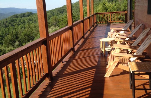 Each bedroom has its own character with en suite full baths and sliding glass doors to outside decks that overlook stunning vistas and wildlife. Wooden decks wrap around the upper and lower floors, with an enclosed screened-in porch on each level. Adirondack, lounge and rocking chairs surround the house - providing ample room to read, bird watch or relax. While the house is spacious, the upstairs is cozy and perfect for couples looking for a mountain getaway. A modern, fully-equipped, luxury kitchen and gas grill provide the tools for wonderful meals. We have a hot tub located in a covered deck with incredible views! Everything you could want for a memorable retreat!