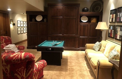 Paintbrush is beautifully located in the premier ski resort of Deer Valley, with ski-in/ski-out access to Banner (beginning green run) on mid-mountain. The top floor of this lovely home includes a fully equipped kitchen, a stunning dining room, a spacious living room with a gorgeous mountain feel including breathtaking views off the front balcony, a master suite with a jacuzzi tub and steam shower, a small ski room to store your skis after a day of fun, and half bath. On the mid-level of this gorgeous home, there is a family room that includes a tv and bumper pool, another master suite with a steam shower, 2 more beautifully decorated bedrooms with queen beds, and a cozy bunk room with 4 beds total. The backyard has access to the ski runs (about 10 steps to the run), a jacuzzi, fire pit, and 2 tables for eating including outdoor heaters and music. Watch skiers go by as you relax in the jacuzzi or take in a breathtaking view from the front patio. This is the perfect vacation home to relax, de-stress, and enjoy life. Good for a couples trip or a family vacation.