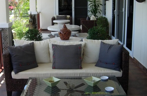 Outdoor space: The villa is set in a large plot with superb gardens and many tropical bushes and flowers. There is a large 10 x 3 covered front terrace which is raised above the garden to provide excellent views of the large fish pond. This runs the width of the home and contains many water plants within and tropical plants surrounding it. On the terrace there is a Thai style marble type dining table with matching bench seating, 2 sofas, 2 chairs and drinks tables. To the side is a large car port and a garden planted with beautiful and various tropical plants. To the rear of the villa is another large covered terrace 6 x 4 m, with a dining table and 6 chairs, 2 large sofas and matching coffee table. This overlooks and leads to the pool, spa and sundeck area with 6 sun loungers.The whole house is surrounded with a 1.8 m wall and the boundaries have been planted with fragrant bushes and palm trees to provide privacy. The private salt water swimming pool is 10 x 4 m.